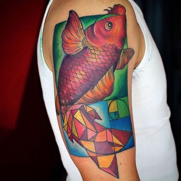 手臂几何图形与鲤鱼彩绘纹身图案