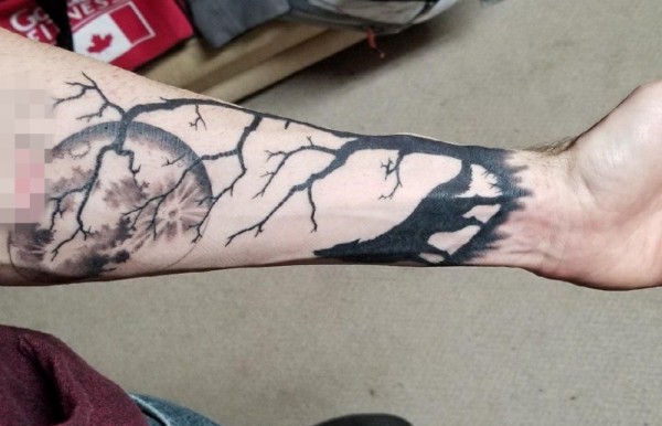 男生手臂上黑色点刺技巧几何线条月亮和枯树纹身图片