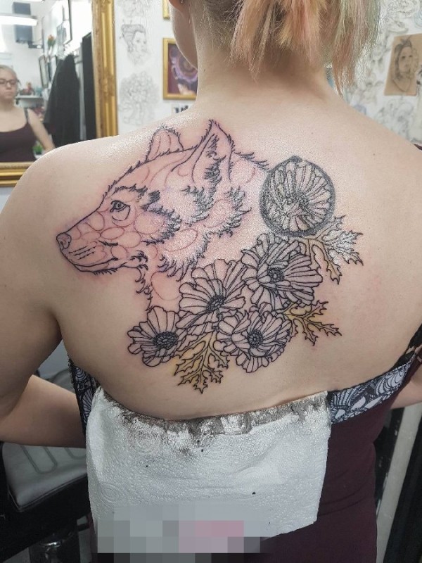 女生背部黑色线条几何元素狼头和花朵纹身图片