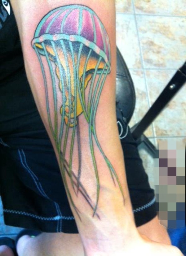 男生手臂上彩绘小动物抽象线条水母纹身图片