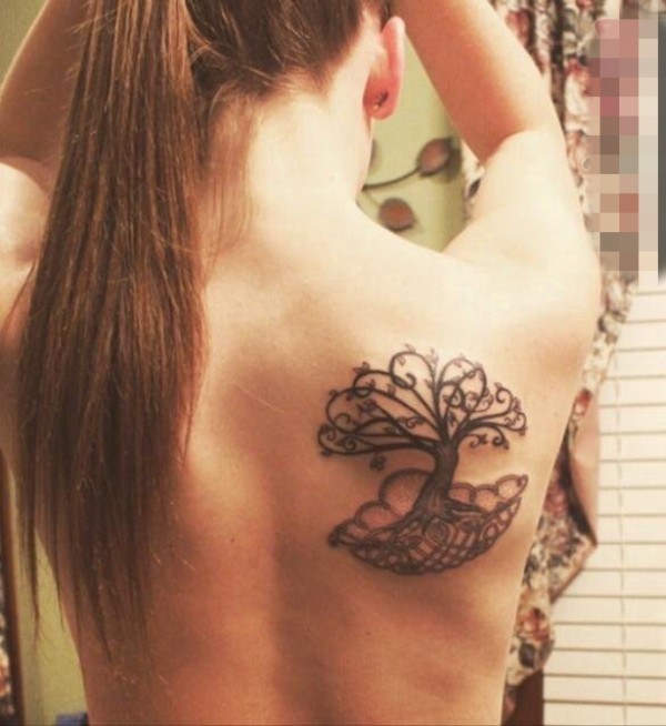 女生背部黑色植物抽象线条生命树纹身图片