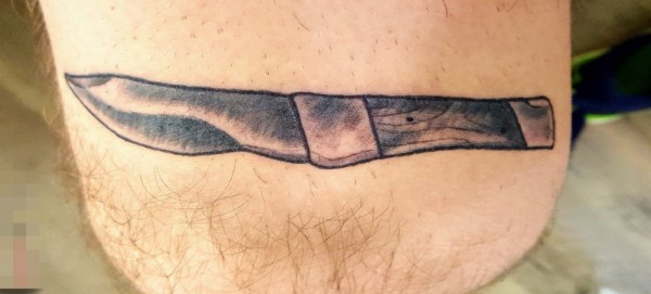 男生大腿上黑灰点刺技巧几何元素抽象线条匕首纹身图片