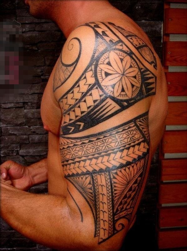 霸气十足的男生手臂上黑色线条几何元素创意图腾花臂纹身图案