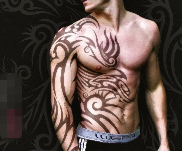 霸气十足的男生手臂上黑色线条几何元素创意图腾花臂纹身图案