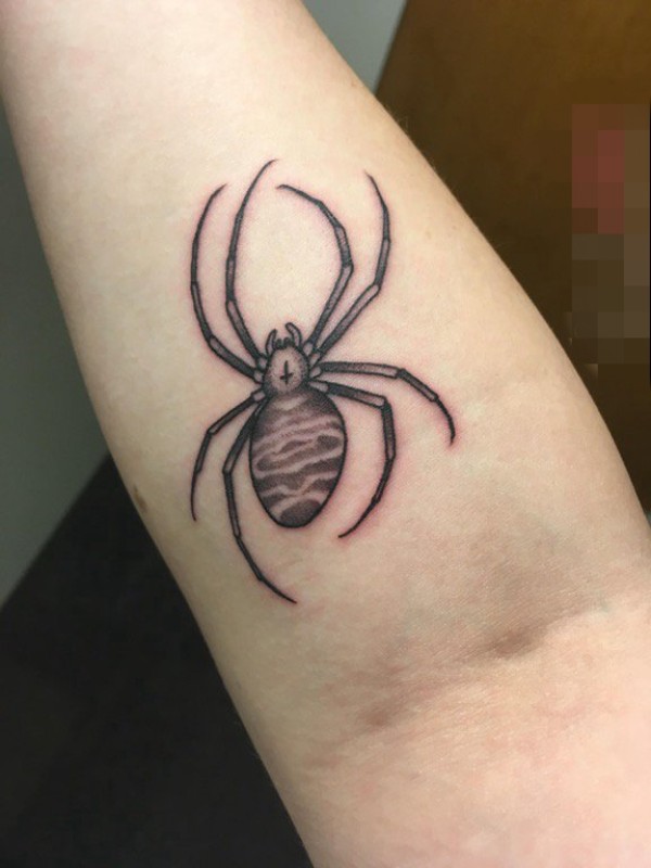 男生手臂上黑灰点刺技巧抽象线条蜘蛛纹身图片