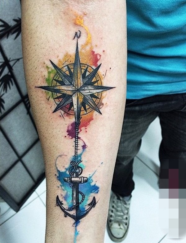 男生手臂上黑灰素描指南针和船锚泼墨纹身图片