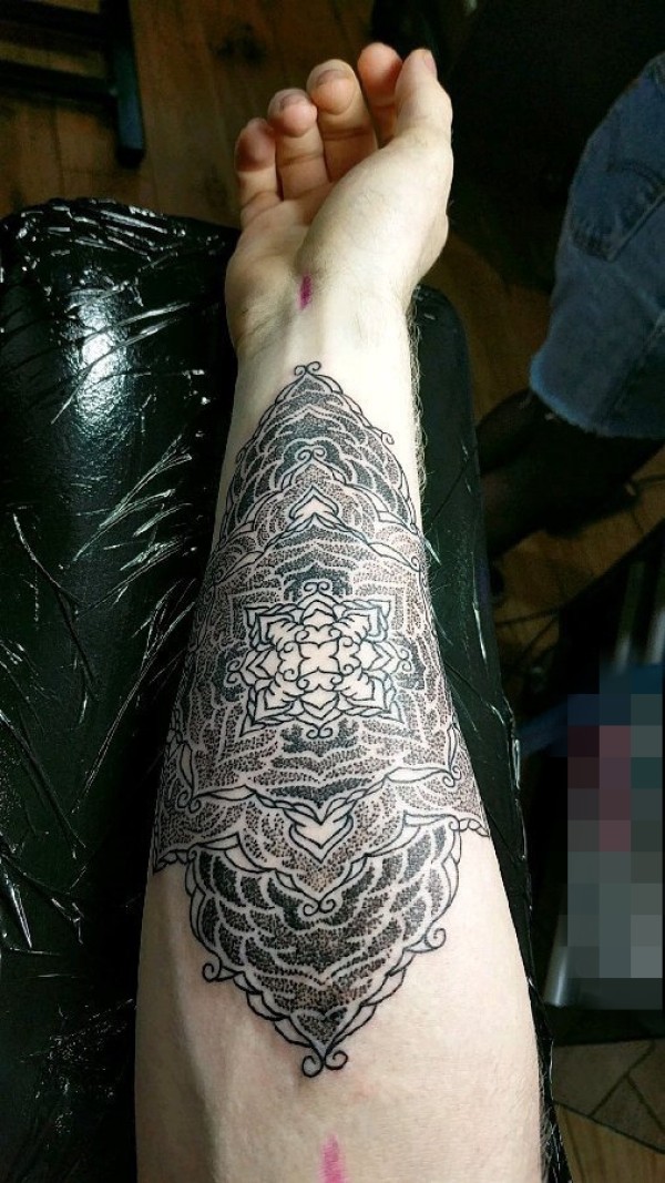 男生手臂上黑灰点刺技巧抽象线条曼陀罗纹身图片
