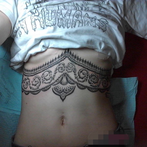 女生胸下黑色素描点刺技巧环绕花纹纹身图片