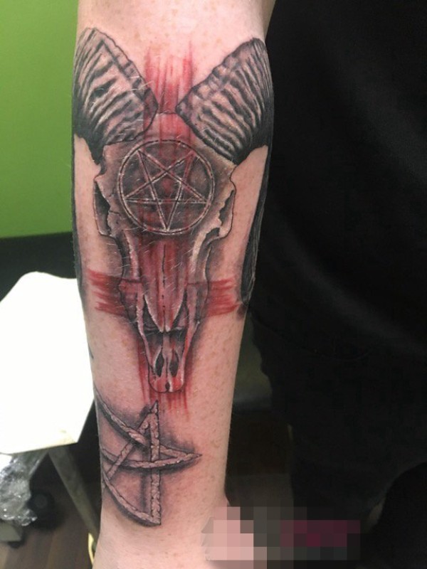 男生手臂上黑灰点刺技巧抽象线条羊头纹身图片