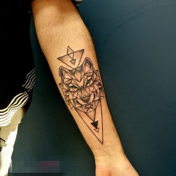 女生手臂上黑色线条几何元素狗纹身图片