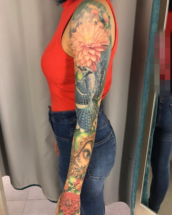 女生手臂上彩绘植物素材花朵和小鸟花臂纹身图片