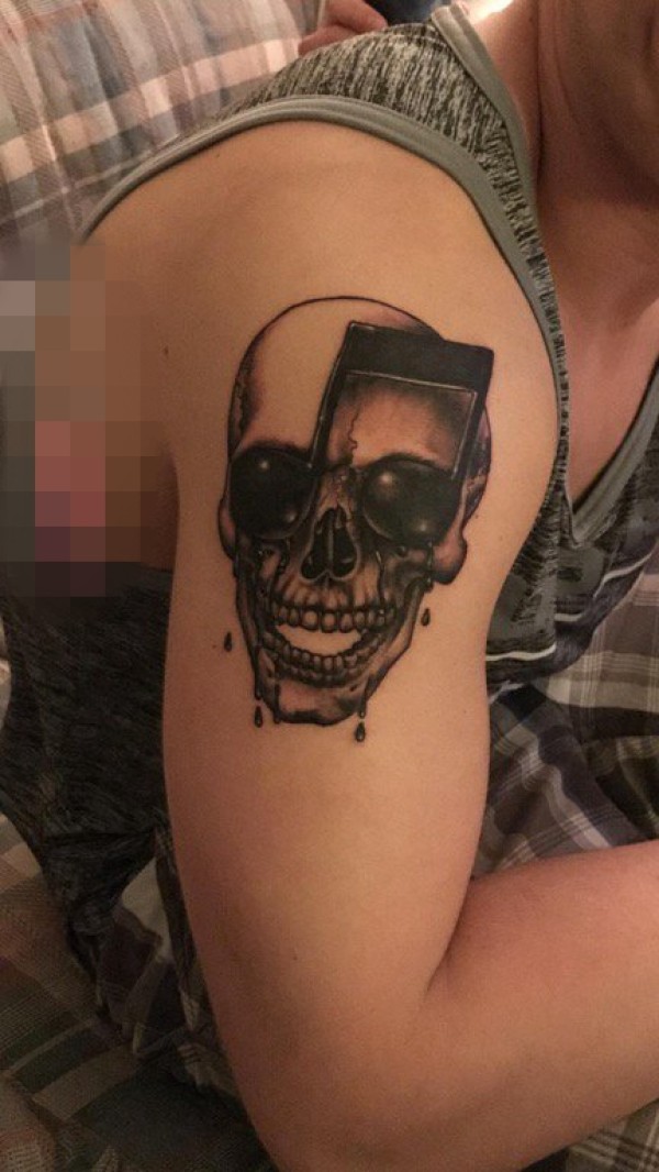 男生手臂上黑色素描创意音符骷髅头纹身图片