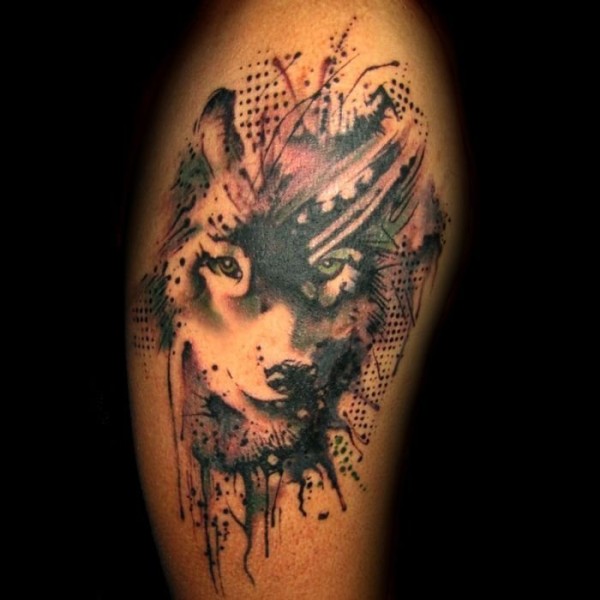 男生喜爱的凶残霸气的点刺技巧几何线条狼头纹身图案
