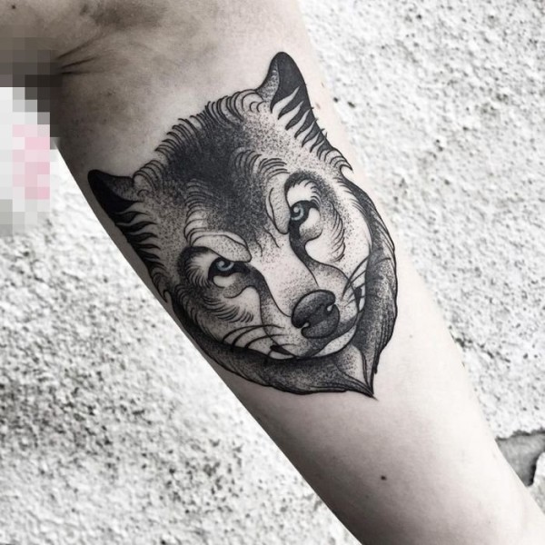 男生喜爱的凶残霸气的点刺技巧几何线条狼头纹身图案