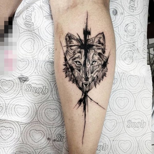 男生喜爱的凶残霸气的点刺技巧几何线条狼头纹身图案
