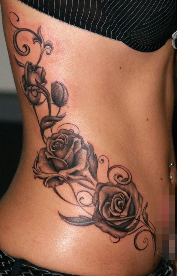 女生侧腰上黑色素描唯美玫瑰纹身图片