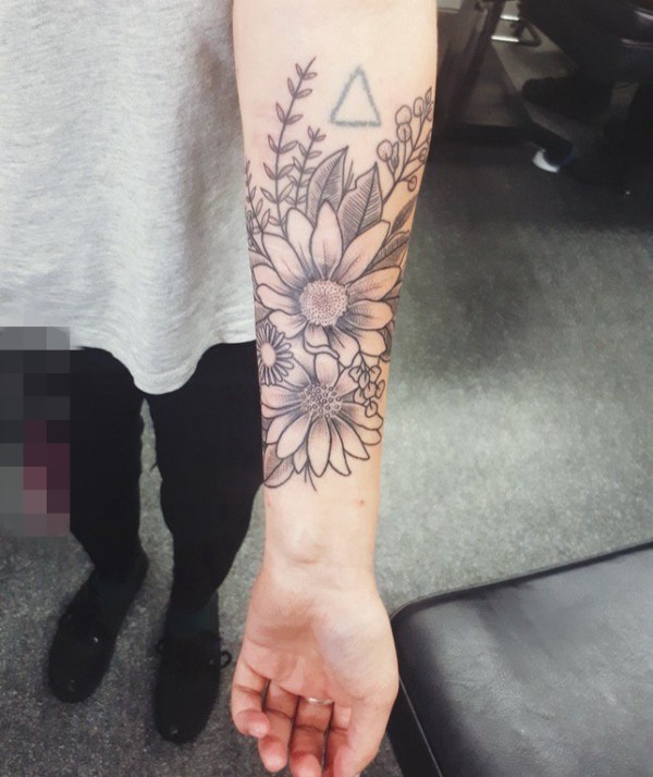 女生手臂上黑灰素描唯美花朵半花臂纹身图片