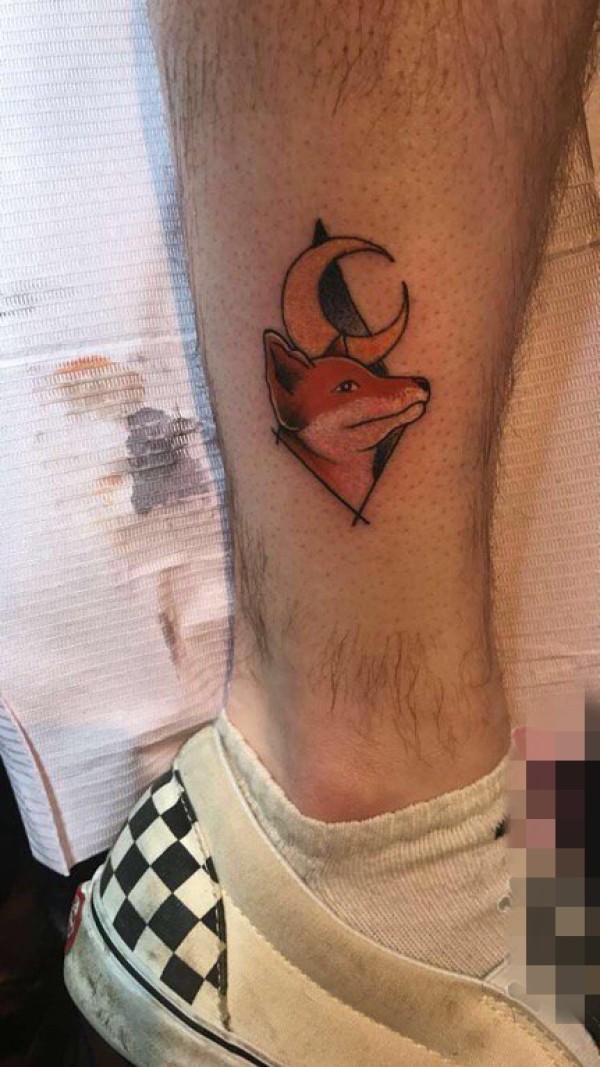 男生小腿上彩绘几何线条月亮和狐狸纹身图片