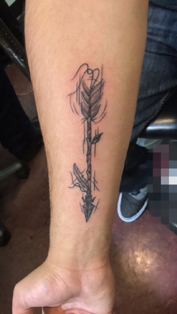 男生手臂上黑灰色线条箭纹身图片