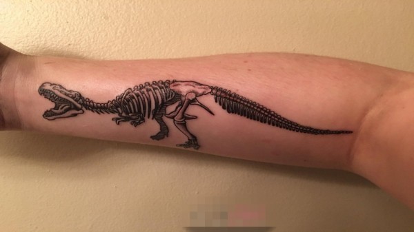 男生手臂上黑色抽象线条恐龙骨架纹身图片
