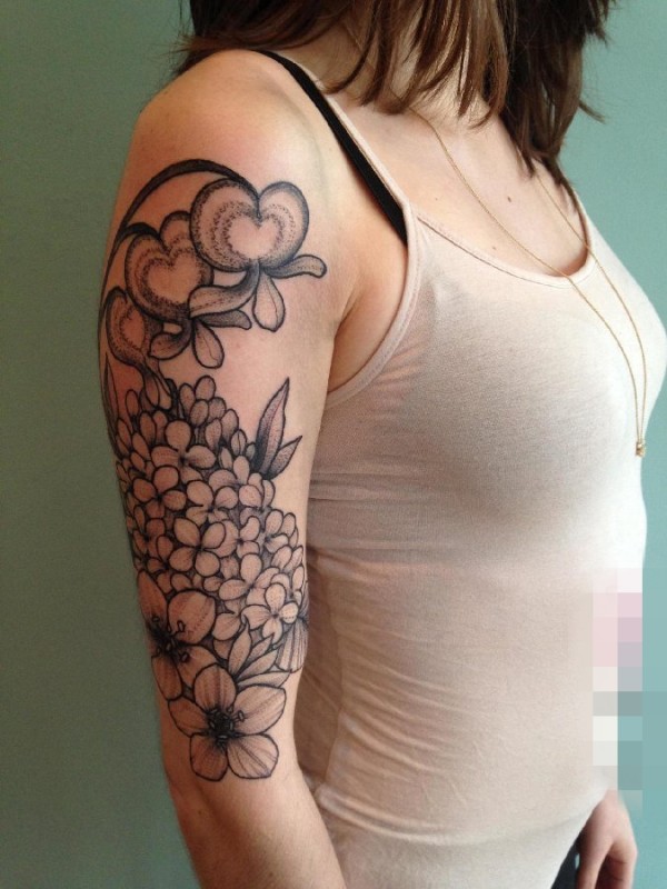 女生手臂上黑白色绣球花与桃花纹身图片