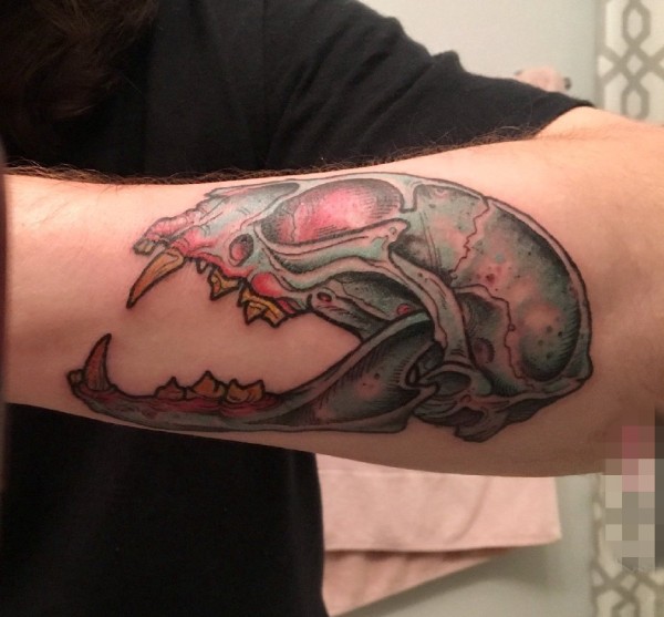 男生手臂上彩绘抽象线条猫头骨纹身图片