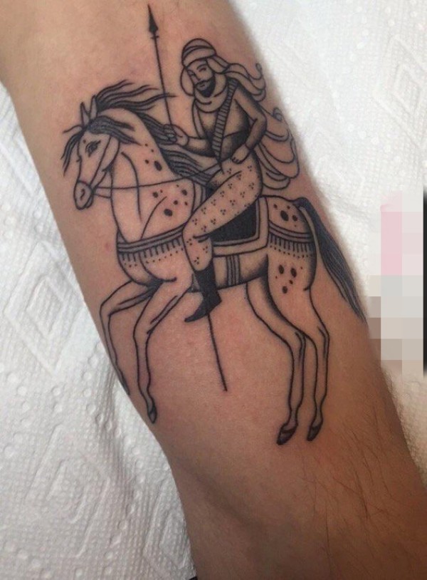 男生手臂上黑色抽象线条马和人物肖像纹身图片