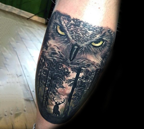 写实风格的彩色猫头鹰和小鹿森林手臂纹身图案