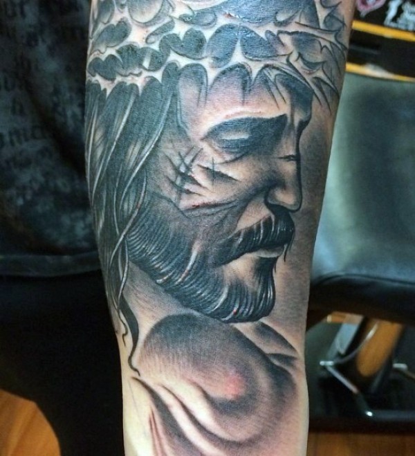 黑色悲伤的耶稣肖像手臂纹身图案