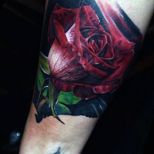非常壮观逼真的彩色玫瑰花手臂纹身图案