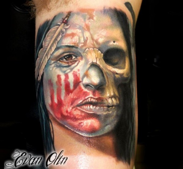 插画风格的彩色印度半女人半骷髅肖像手臂纹身图案