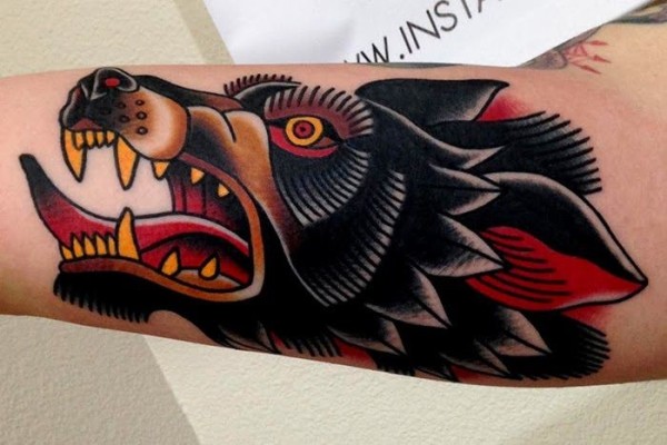old school彩色疯狂的狼头手臂纹身图案