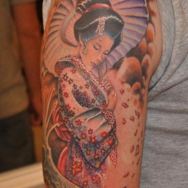 迷人的腼腆亚洲艺妓与和服花瓣手臂纹身图案