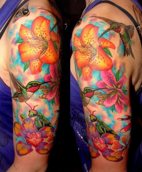 鲜艳的百合花蜂鸟蜜蜂和蚱蜢手臂纹身图案