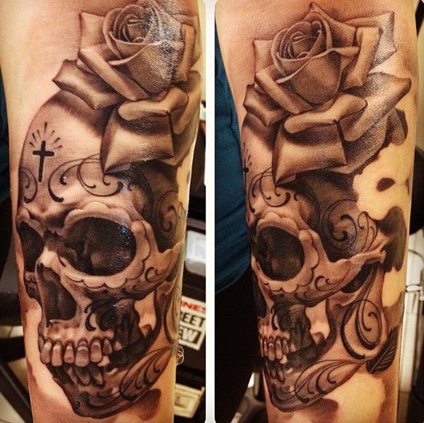 非常逼真的写实黑白骷髅和玫瑰花手臂纹身图案