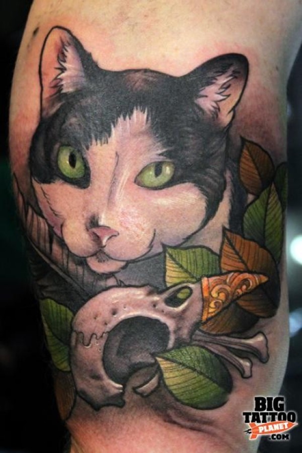 美丽的彩色猫与鸟头骨树叶手臂纹身图案