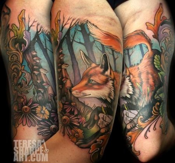 old school丰富多彩的狐狸和森林手臂纹身图案