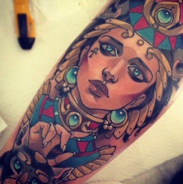 美丽的五彩埃及女人肖像与猫手臂纹身图案