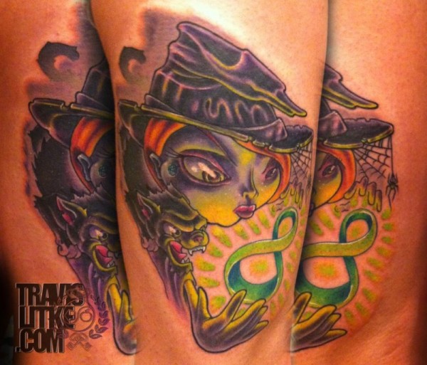 手臂彩色幻想女巫与蝙蝠和无穷符号纹身图案