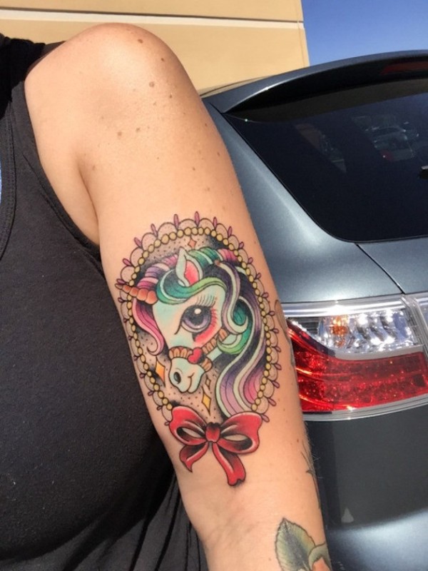 可爱的彩色卡通独角兽与红色蝴蝶结手臂纹身图案