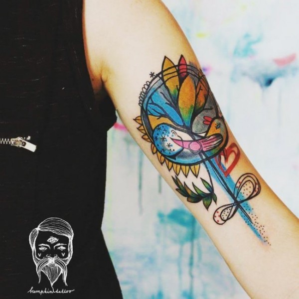 old school花朵小鸟和心形彩色手臂纹身图案