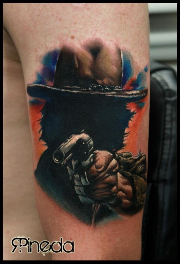华丽的彩色神秘牛仔与手枪手臂纹身图案