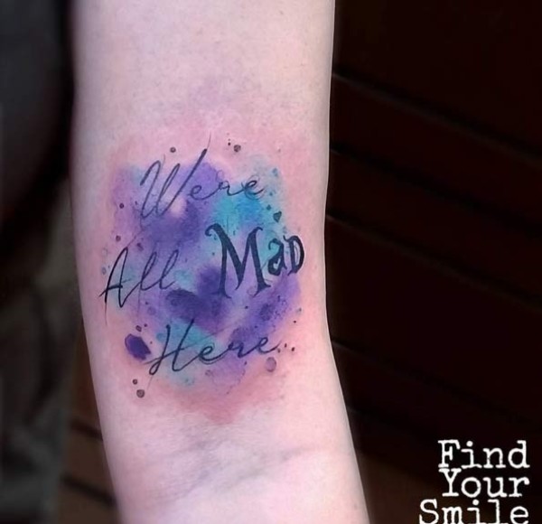 有趣的字母和紫蓝色泼墨水彩手臂纹身图案