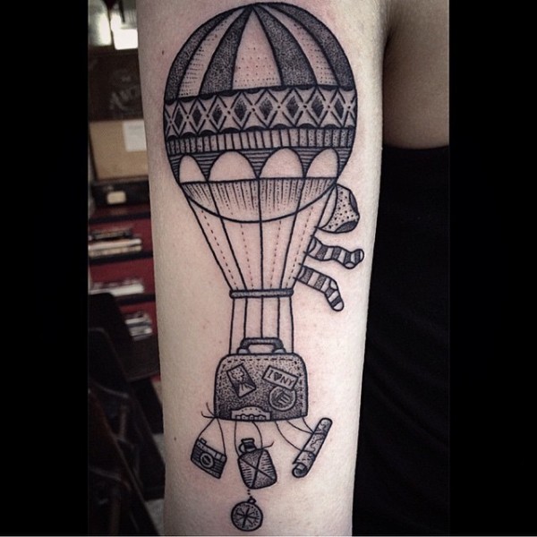 old school创意黑色热气球结合皮包衣服手臂纹身图案