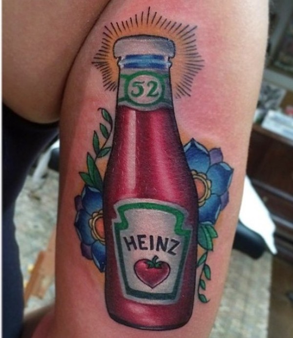 手臂奇妙的五彩番茄酱瓶和花朵纹身图案
