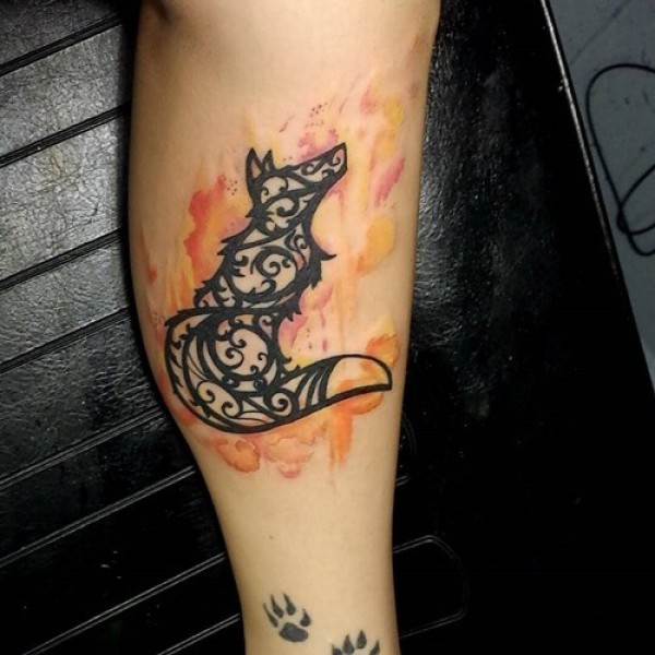 手臂简单设计的黑色部落狐狸图腾和火焰纹身图案