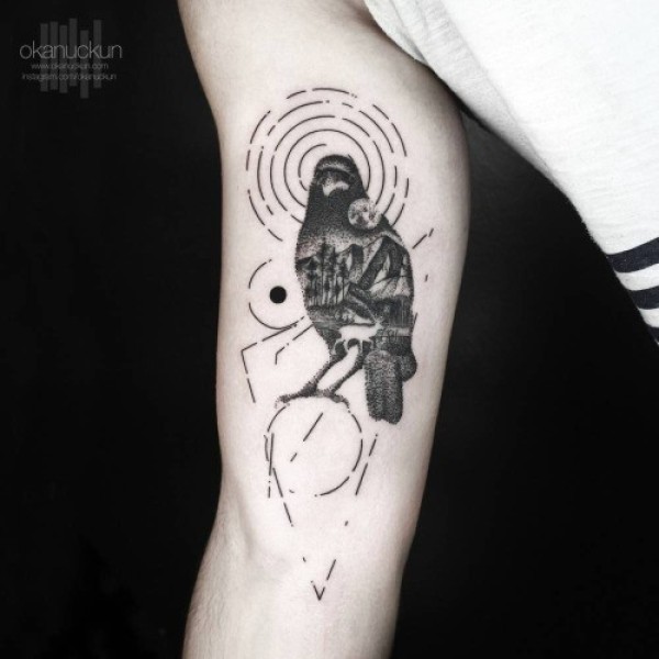 有趣的黑色神秘乌鸦和几何圆手臂纹身图案