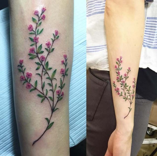娇嫩的粉红色小花朵树枝手臂纹身图案
