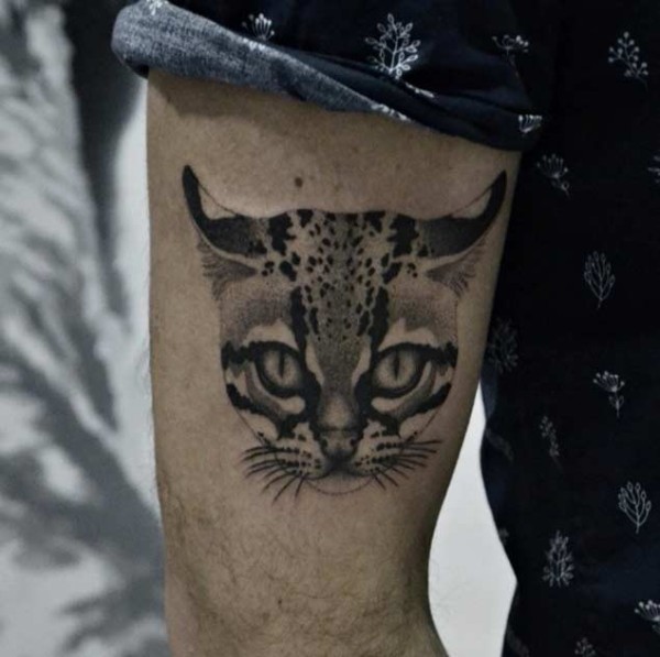 手臂微小的自然黑色野猫头像纹身图案