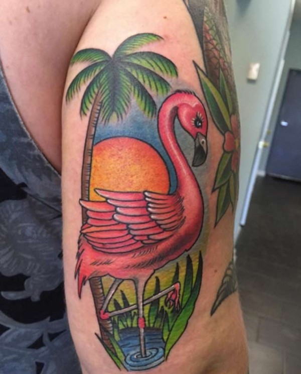 漂亮的彩色棕榈树和太阳火烈鸟手臂纹身图案